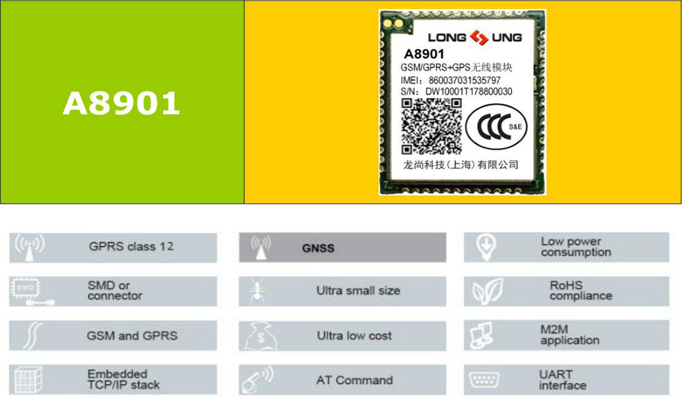 Designed for use in any GSM network in the world, Longsung A8901 is a Dual-band GSM/GPRS module that works on 900/1800MHz, A8901 features GPRS multislot class 10 and supports the GPRS coding schemes CS-1, CS-2, CS-3 and CS-4.