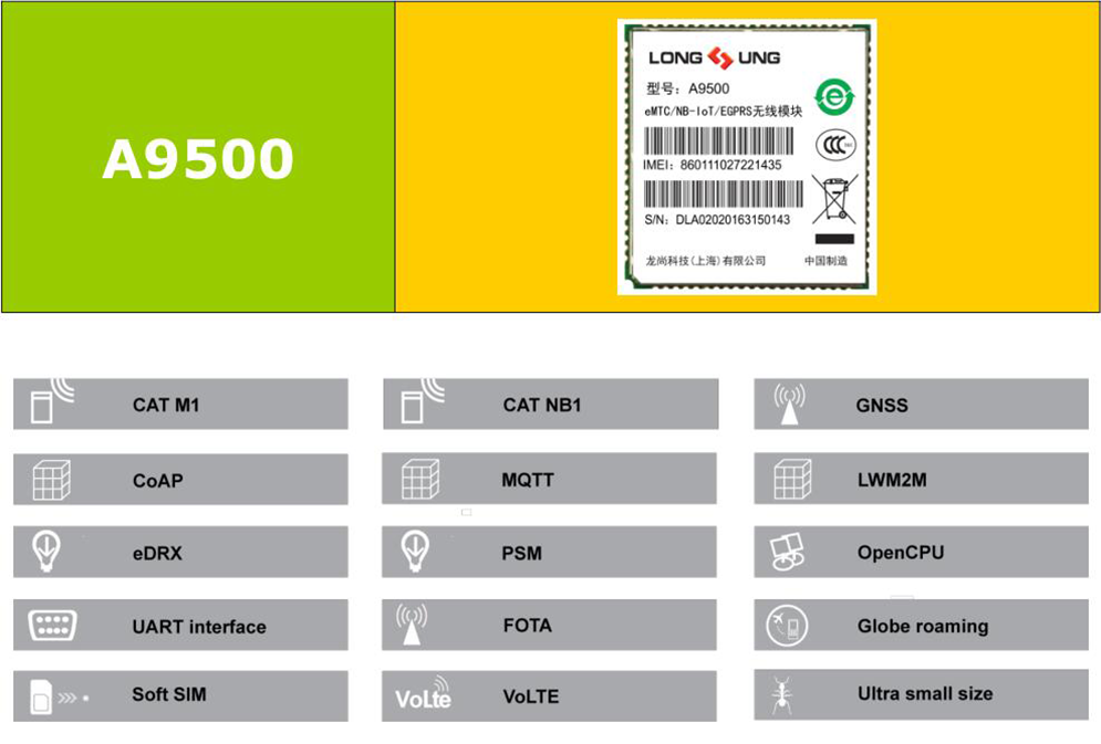 Longsung A9500 is one of the smallest LPWAN modules in LCC castellation packaging with the compact size of 24.0 × 26.0 × 2.5mm, ultra low power consumption and extended temperature range.