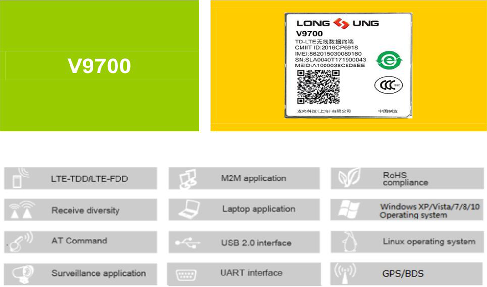 在 LTE-TDD/LTE-FDD 制式下,V9700 上下行速率可以达到 50Mbps 和 150Mbps,在没有 LTE 覆盖的情 况下,V9700 还可以可靠安全地注册到 3G(TD-SCDMA/UMTS/EVDO)或 2G(EDGE/GPRS/CDMA) 网络。